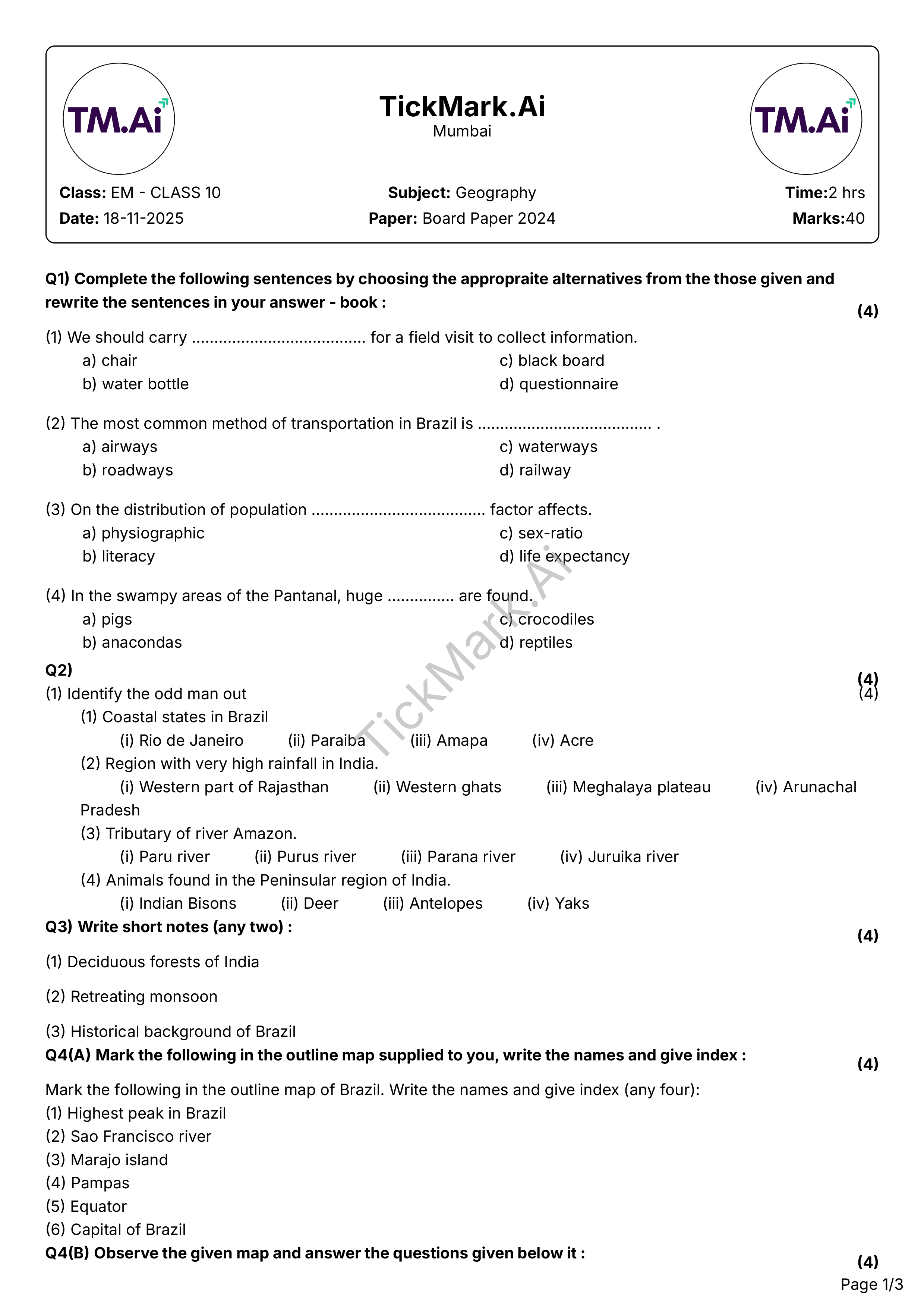 Download Free Geography March 2024 Board Q&A Paper For 10th Class Maharashtra Board By TickMark.Ai 21/02/2026 Related Board Papers Download Free Science 2 Semester 2 Q&A Paper For 9th Class Maharashtra Board Download Free Question Paper Download Free Answer Paper Download Free Question... Read more Board Papers Download Free Hindi Unit Test 2 Q&A Paper For 9th Class Maharashtra Board Download Free Question Paper Download Free Answer Paper Download Free Question... Read more Board Papers Download Free English Semester 1 Q&A Paper For 9th Class Maharashtra Board Download Free Question Paper Download Free Answer Paper Download Free Question... Read more Algebra Download Free Algebra Semester 2 Q&A Paper For 9th Class Maharashtra Board Download Free Question Paper Download Free Answer Paper Download Free Question... Read more TickMark.Ai About Us Test Paper Generation Software for Teachers TickMark.Ai is a next-generation... Read more Share WhatsApp Board PapersClass 10GeographyMaharashtra Board Paper Views: 11 Download Free Question Paper Download Free Answer Paper Download Free Question Paper Download Free Answer Paper Previous articleDownload Free Hindi March 2025 Board Q&A Paper For 10th Class Maharashtra BoardNext articleDownload Free History and Political Science March 2024 Board Q&A Paper For 10th Class Maharashtra Board