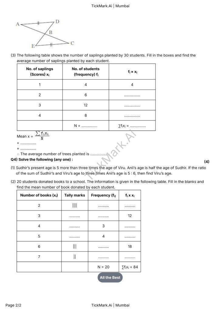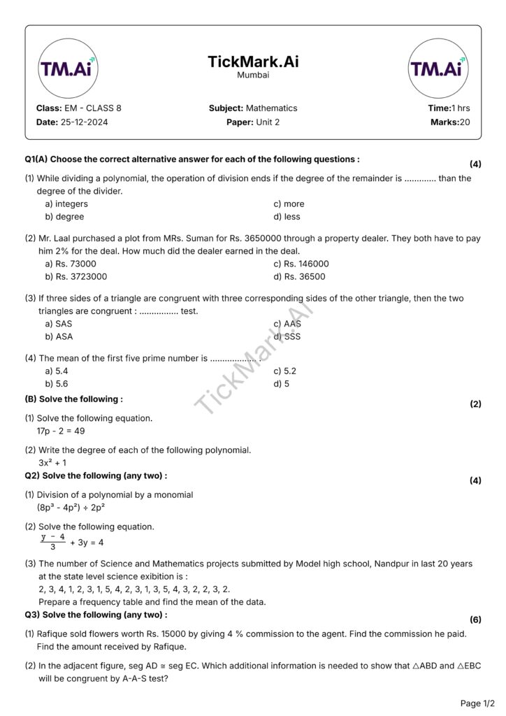 Download Free Maths Unit 2 Question Paper For 8th Class Maharashtra Board Explore Papers Class 5 Download Free Hindi Unit 2 Test Paper For 5th Class Maharashtra Board Download Question Paper Download Answer Paper Read more Class 10 Download Free Semester 1 Geometry Question Paper For 10th Class Maharashtra Board Download Question Paper Download Answer Paper Read more Class 6 Download Free Histroy and Civics Objective Worksheet For 6th Class Maharashtra Board Download Question Paper Download Answer Paper Read more Class 9 Download Free Geometry Unit 2 Question Paper For 9th Class Maharashtra Board Download Question Paper Download Answer Paper Download Question Paper Download Answer Paper Read more About TickMark Say Goodbye to Manual Test Paper Creation! Creating test papers manually is a time-consuming and tedious... Read more Load more Maharashtra BoardClass 8MathsUnit Test Download Question Paper Download Answer Paper Download Question Paper Download Answer Paper Previous articleDownload Free English Unit 2 Question Paper For 8th Class Maharashtra BoardNext articleDownload Free Science Unit 2 Question Paper For 8th Class Maharashtra Board