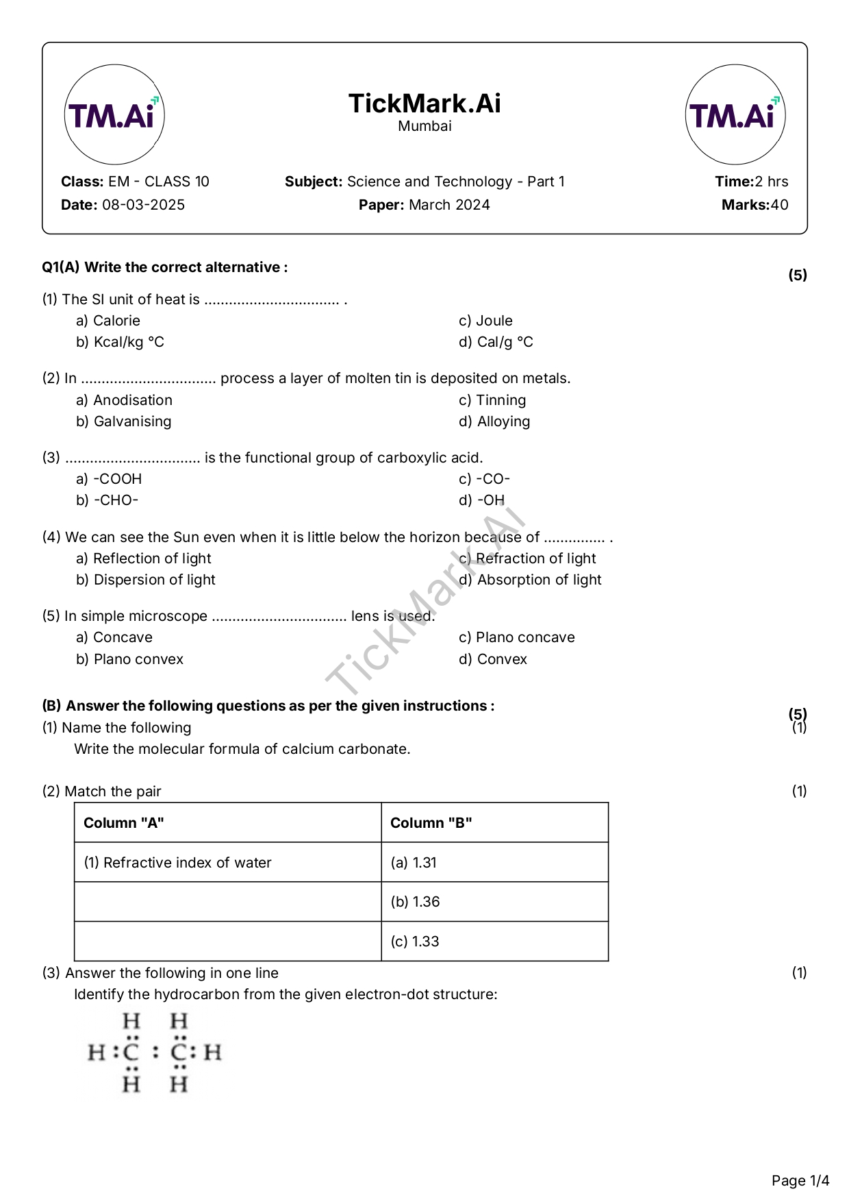 Download Free Science 1 March 2024 Board Q&A Paper For 10th Class Maharashtra Board By Archana 21/02/2026 Related Board Papers Download Free Science 2 Semester 2 Q&A Paper For 9th Class Maharashtra Board Download Free Question Paper Download Free Answer Paper Download Free Question... Read more Board Papers Download Free Hindi Unit Test 2 Q&A Paper For 9th Class Maharashtra Board Download Free Question Paper Download Free Answer Paper Download Free Question... Read more Board Papers Download Free English Semester 1 Q&A Paper For 9th Class Maharashtra Board Download Free Question Paper Download Free Answer Paper Download Free Question... Read more Algebra Download Free Algebra Semester 2 Q&A Paper For 9th Class Maharashtra Board Download Free Question Paper Download Free Answer Paper Download Free Question... Read more TickMark.Ai About Us Test Paper Generation Software for Teachers TickMark.Ai is a next-generation... Read more Share WhatsApp Board PapersClass 10Maharashtra BoardScience 1 Paper Views: 9 Download Free Question Paper Download Free Answer Paper Download Free Question Paper Download Free Answer Paper Previous articleDownload Free Geometry March 2024 Board Q&A Paper For 10th Class Maharashtra BoardNext articleDownload Free Science 2 March 2024 Board Q&A Paper For 10th Class Maharashtra Board