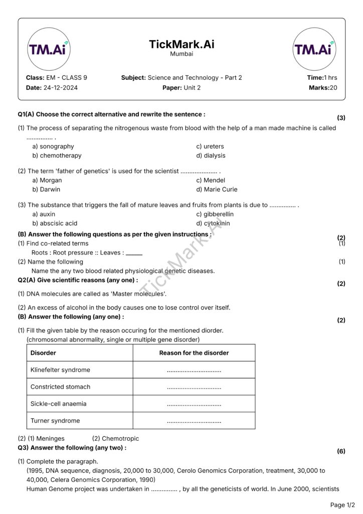 Download Free Science 2 Unit 2 Question Paper For 9th Class Maharashtra Board Explore Papers Class 5 Download Free EVS Monthly Test Paper For 5th Class Maharashtra Board Download Question Paper Download Answer Paper Read more Class 3 Download Free Maths Unit 1 Test Paper For 3th Class Maharashtra Board Download Question Paper Download Answer Paper Read more Class 8 Download Free Geography Semester 2 Test Paper For 8th Class Maharashtra Board Download Question Paper Download Answer Paper Read more About TickMark Say Goodbye to Manual Test Paper Creation! Creating test papers manually is a time-consuming and tedious... Read more Board Papers Download Free Geography March 2024 Board Q&A Paper For 10th Class Maharashtra Board Download Question Paper Download Answer Paper Download Question Paper Download Answer Paper Read more Load more Maharashtra BoardClass 9Science 2Unit Test Download Question Paper Download Answer Paper Download Question Paper Download Answer Paper Previous articleDownload Free Geometry Unit 2 Question Paper For 9th Class Maharashtra BoardNext articleDownload Free History and Political Science Unit 2 Question Paper For 9th Class Maharashtra Board